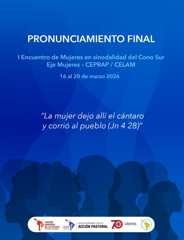 Pronunciamiento final. I Encuentro de Mujeres en sinodalidad del Cono Sur Eje Mujeres – CEPRAP / CELAM -16 al 20 de marzo 2026- “La mujer dejo allí el cántaro y corrió al pueblo (Jn 4 28)” Las mujeres del I Encuentro de Mujeres en Sinodalidad del Cono Sur alzan una voz profética desde sus territorios, unidas en comunión, escucha y discernimiento colectivo. Inspiradas en la mujer samaritana, renuevan su compromiso con una Iglesia sinodal, inclusiva y corresponsable, reafirmando la dignidad y los liderazgos de las mujeres.